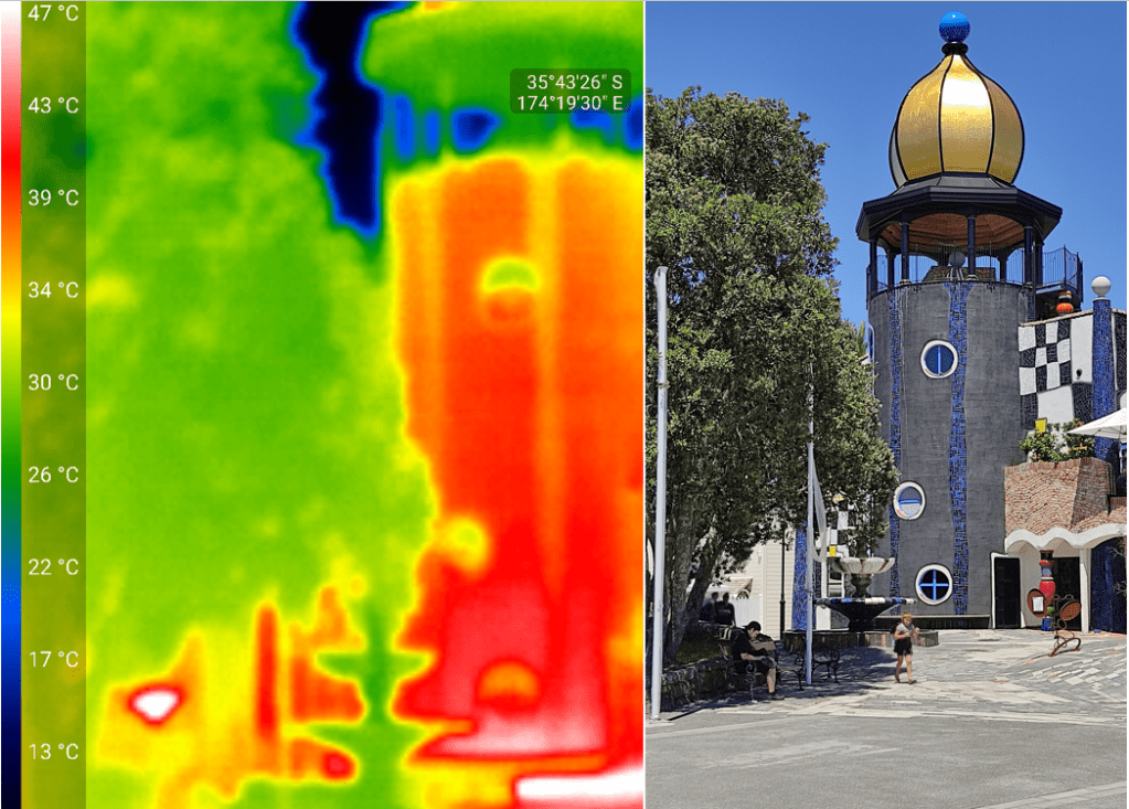 Last summer I spent some time taking infrared images of places in Tai Tokerau including our city. You can read more about it in this post. I was amazed by the differential between constructed surfaces, or bare soils and vegetation. The difference was often 20 degrees centigrade or more as demonstrated in the image below.