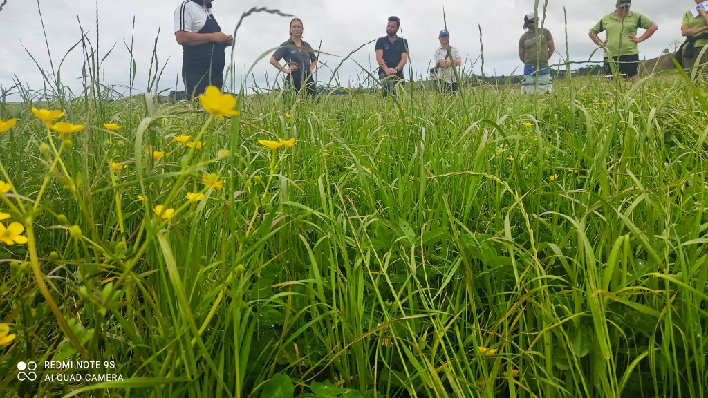 West Wind Farm, south of Te Kopuru, had heavy rain too. David Cole had considered canceling the field day scheduled for 16 November. He thought the paddocks would be too wet. The paddock in the above image had been under water a few days earlier, but the diverse, lush pasture with the inclusion of some deep-rooted plants ensured that the paddock drained effectively and retained a lot of water. As the discussion in the paddock continued, some of us sat down on the ground!