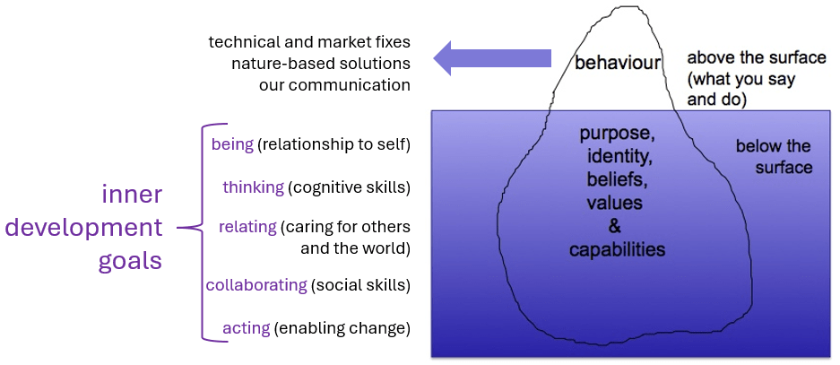 You may recognise the iceberg diagramme below. The behaviours I have been persuing were first techical fixes, and then nature-based solutions. I later came to the conclusion that the most important job was to communicate solutions and hope. There is an even more fundamental place to work to heal the climate. These have been called the Inner Development Goals.