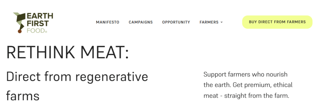 Earth First Food “flips the script on meat production”. They “empower regenerative farmers to keep profits on the farm, delivering you ethically raised, higher-quality meat – while restoring the land for future generations”.