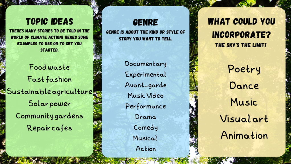 - https://seechange.org.au/futurefilm – another youth based climate change film competition. There’s a few helpful slide shows about film making down the bottom of this page.